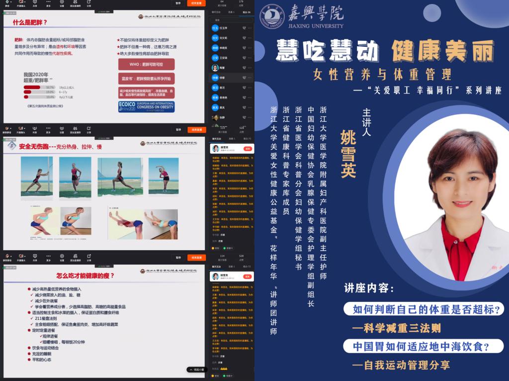 妇委会承办的“关爱职工,幸福同行”系列讲座之《女性营养与体重管理》在钉钉直播群举行,邀请浙江大学医学院附属妇产科医院姚雪英医师主讲,我校100余名女教职工参加线上讲座。