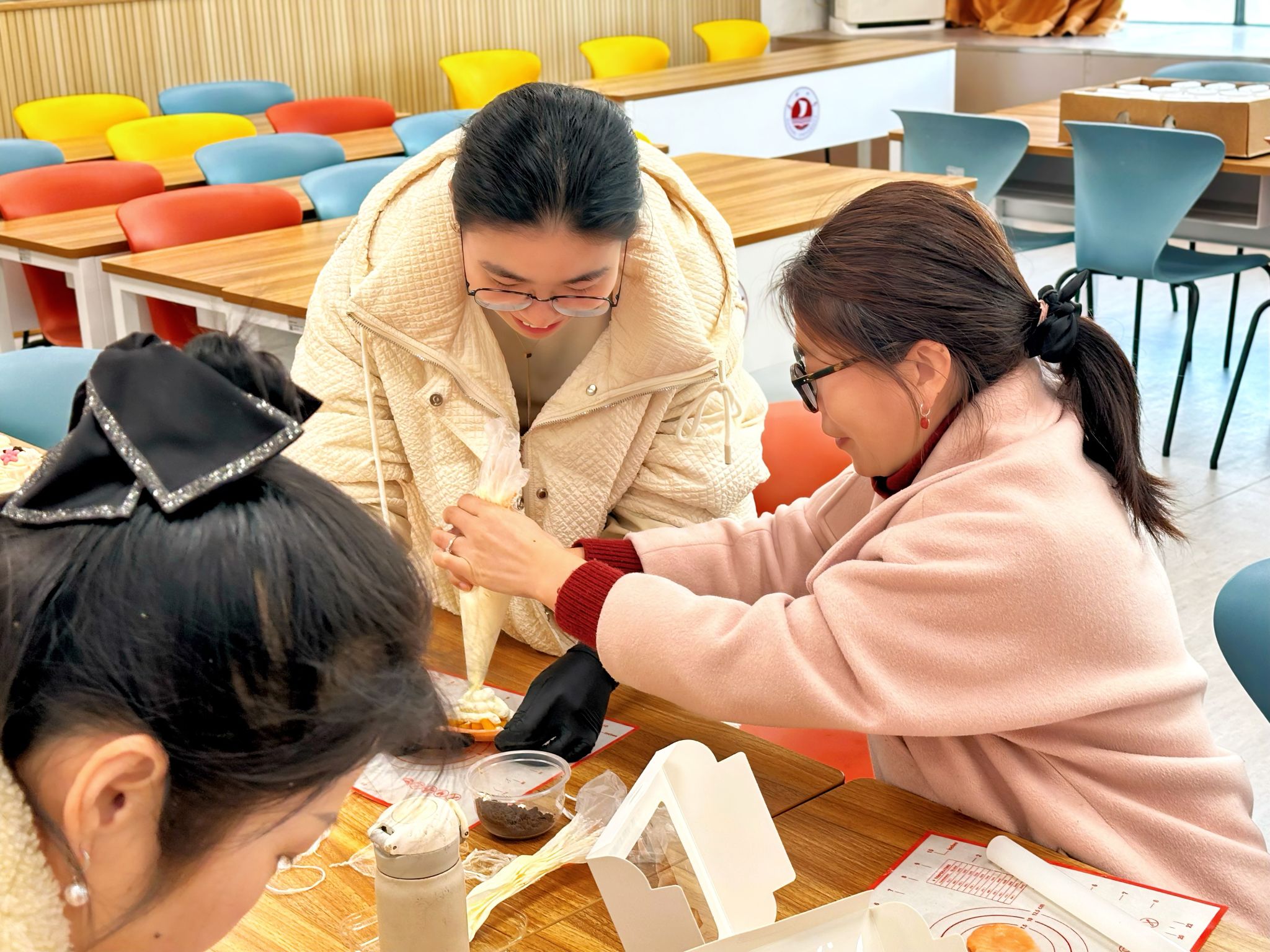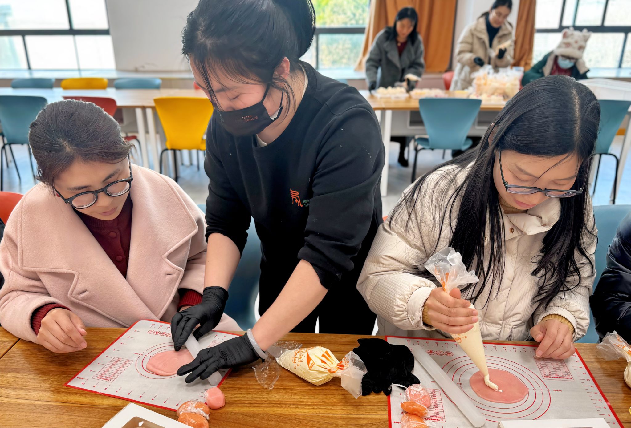 活动现场洋溢着浓厚的节日气息。两院工作人员早早布置了现场、准备材料,女教职员工们热情高涨,纷纷挽起袖子“一较高下”。在纸杯蛋糕装饰环节,老师们手持奶油裱花袋,小心翼翼地挤出细腻的奶油花,每一道弧线、每一个褶皱都饱含着用心。在雪媚娘的制作过程中,经过烘焙老师的指导,大家可以熟练地制作糯米皮、调制内馅,手法娴熟而利落。大家在欢声笑语中分享彼此在工作中的点滴成就和生活中的美好瞬间。活动还贴心地为大家设置了茶歇区,活动现场充满欢声笑语。