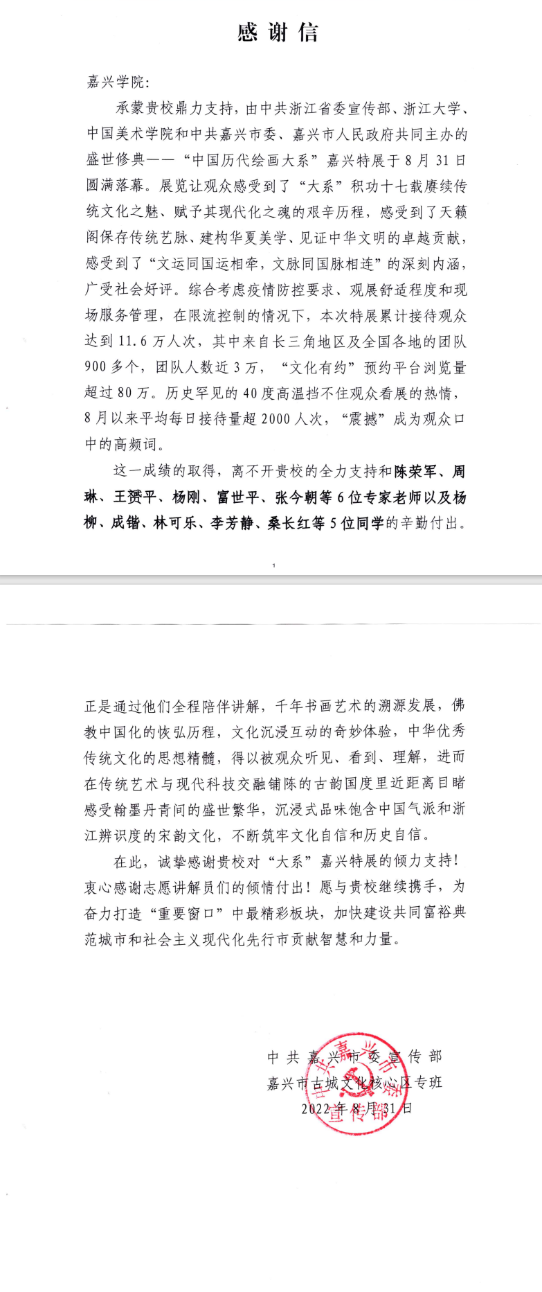 9月1日,动漫巴士 收到中共浙江省嘉兴市委宣传部感谢信,感谢学院教师张今朝利用暑期对盛世修典——“中国历代绘画大系”嘉兴特展的倾情付出。
