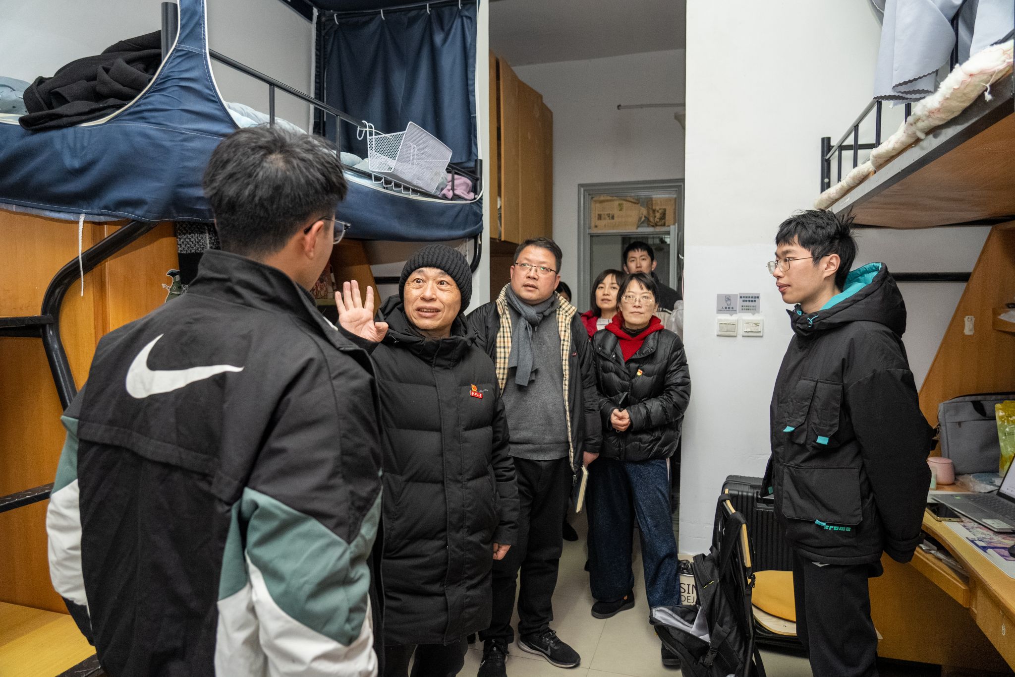每到一个寝室,陆院士与同学们亲切交流,详细了解大家的学习、生活情况以及未来规划。交流中,周边寝室同学听闻陆校长来了,纷纷走近。见此,陆院士将红船精神与预警机精神融合,对大家提出了三点要求:一要始终心怀“国之大者”,敢为人先、当仁不让,努力为高水平科技自立自强、实现高质量发展贡献一份力量;二要学习雷锋精神、时传祥精神,立足岗位,把个人有限的生命投入到无限的为人民服务事业中去;三要多读书,读好书,既读有字之书,又读社会的无字之书,要明白自己“为什么读书”,“如何读书”,并踏实肯学才能求得真理。