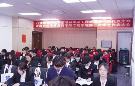 信息科学与工程学院第一次代表大会暨第一次学生代表大会在融信楼552会议室召开。校团委兼职副书记李雷、院党总支书记朱奕远、院学工办主任莫晓燕、院团委老师黄栋栋、嘉兴市学生联合会执行主席于圣洋、校学生会执行主席沈亚轩和各兄弟学院团干部、学生会主席应邀出席,55名团员代表和60名学生代表参会。