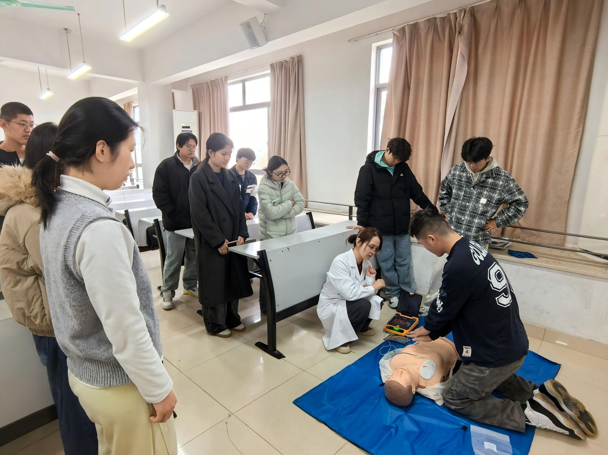 校医院陆益老师为同学们系统讲解心肺复苏、AED(自动体外除颤器)使用及海姆立克急救法等核心急救技能。为增强实操效果,现场配备两套心肺复苏与AED训练设备。同学们在近距离观摩老师规范演示后,亲自进行操作练习,快速掌握关键动作与要领,有效提升应对突发状况的急救能力。